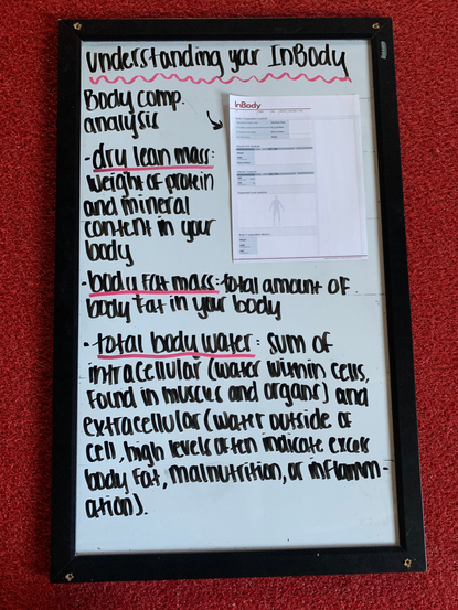 First let’s understand what the InBody machine does. The InBody uses bioelectric impedance to analyze your body's composition. This method sends a small current through the body. Follow along on your own InBody sheet or on the attached picture (: